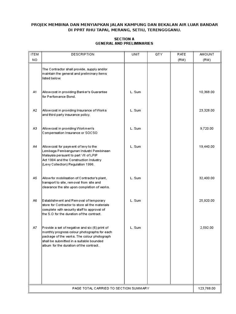 Bq Preliminaries Projek Paip Air Dan Jalan Di Besut2 Concrete Business