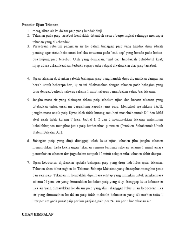 Kerosakan atau kegagalan berfungsi kabel elektrik atau. Langsung menguji paip dengan menyuntik air di bawah tekanan yang meningkat melebihi tekanan operasi maksimum. Iii Ujian Tekanan Udara - Bertujuan untuk menguji kebocoran ke atas paip salir.